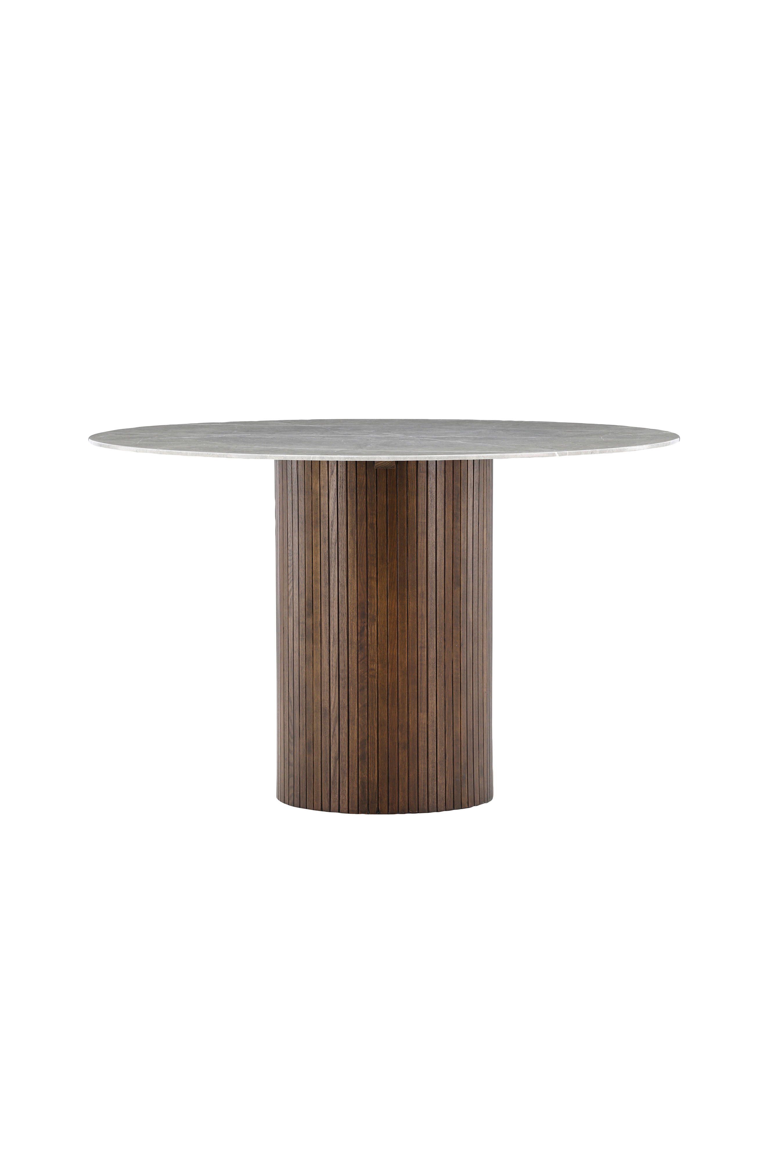 Matbordet austin har en unik design med en läcker skiva i marmor imitation! Det här matbordet tillhör vind kollektionen och har en cylinderformad stomme i ribbat, mörkbrunt trä och en rund bordsskiva i grå marmor look som ger ett härligt liv åt blickfånget, ett runt matbord passar perfekt för att skapa gemenskap vid måltiderna, här hamnar ingen på kanten, matcha med ett par bekväma matstolar och förläng de trivsamma stunderna kring matbordet! Mått: ø120 h74