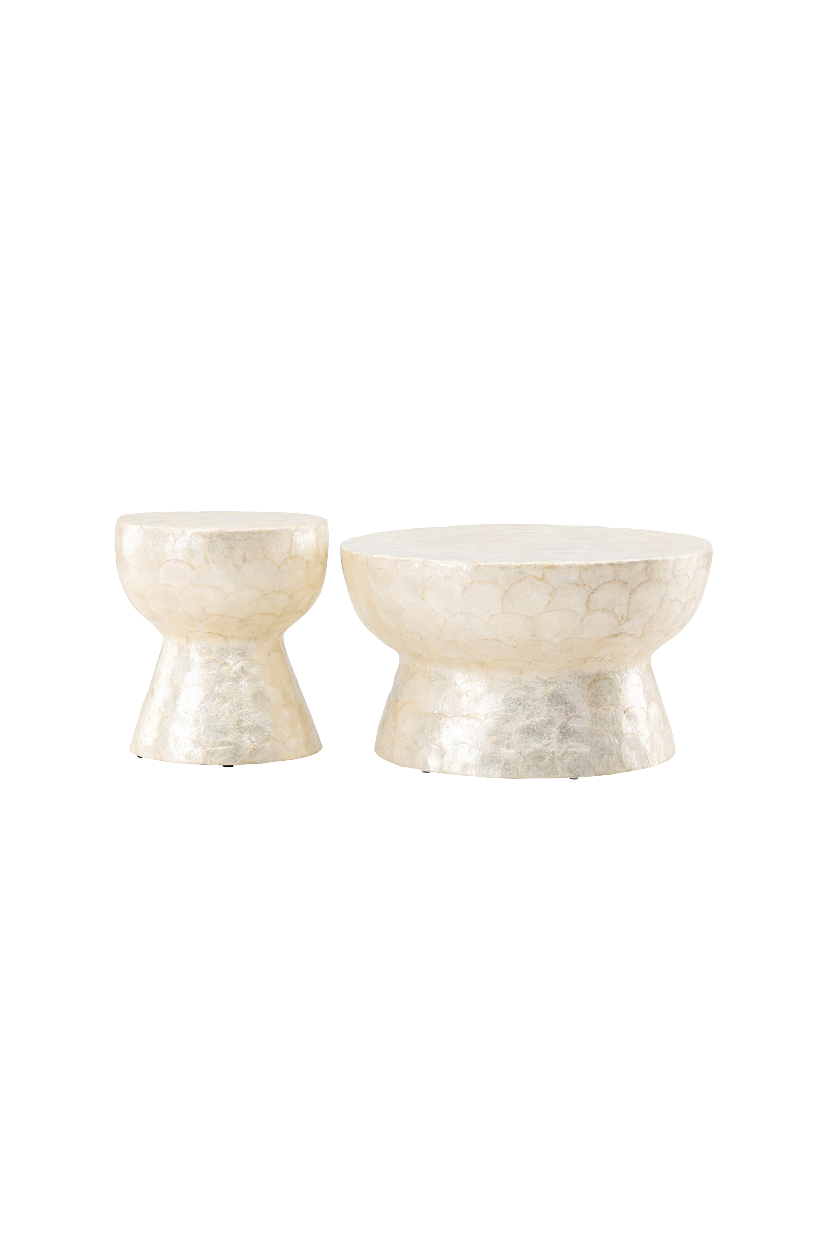 Smögen är ett elegant set med två stilrena bord tillverkade av det vackra materialet capiz. Borden finns i två olika storlekar - ett större med en diameter på 70 cm och ett mindre med en diameter på 40 cm. Det mindre bordet är perfekt att kombinera med varandra och kan enkelt skjutas in under det större bordet, vilket skapar en flexibel och dynamisk inredningslösning. Borden har en neutral beige färg som sömlöst smälter in i olika inredningsstilar och ger en naturlig touch till utrymmet. Smögen-borden är både funktionella och estetiskt tilltalande, vilket gör dem till ett perfekt val för det designmedvetna hemmet.