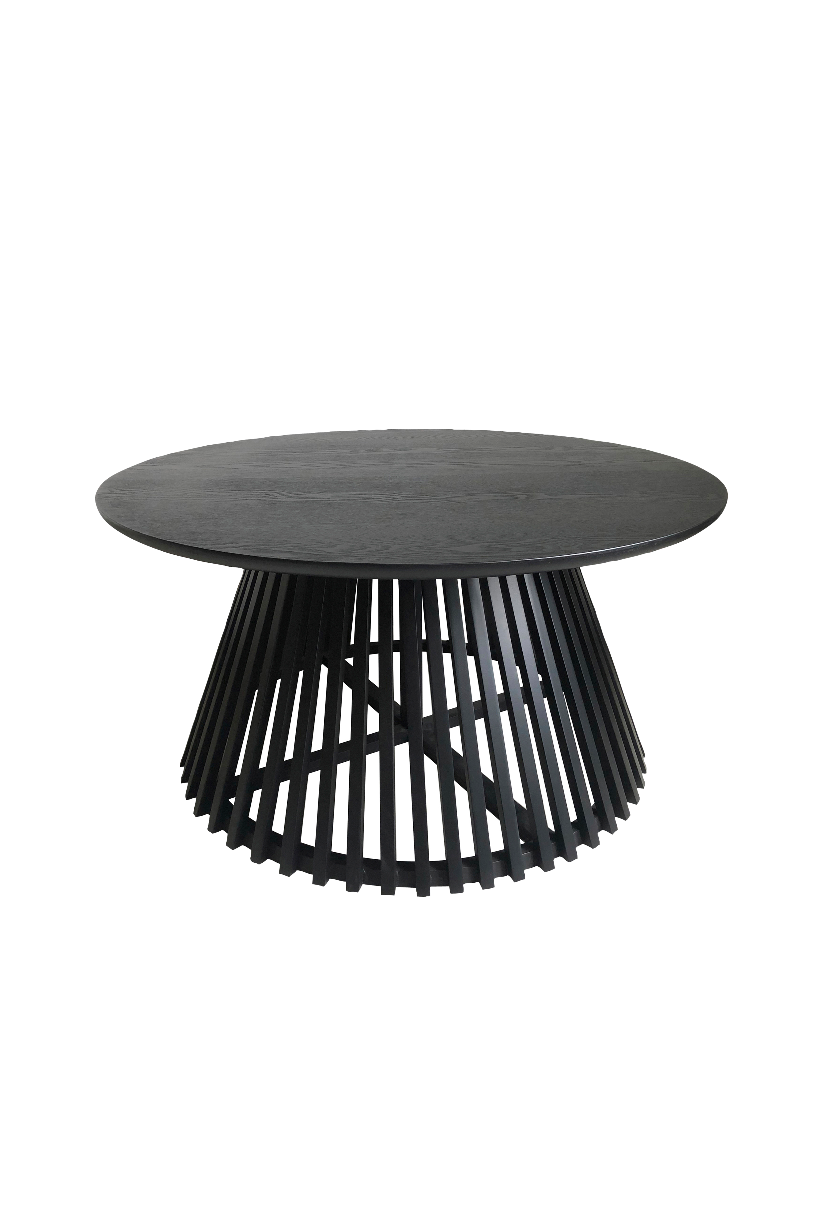Slats Low har en höjd på 40 cm. Bordsskivan har diameter 80 cm och är 2 cm tjock. Fotens spjälor är sammanbundna med träringar.