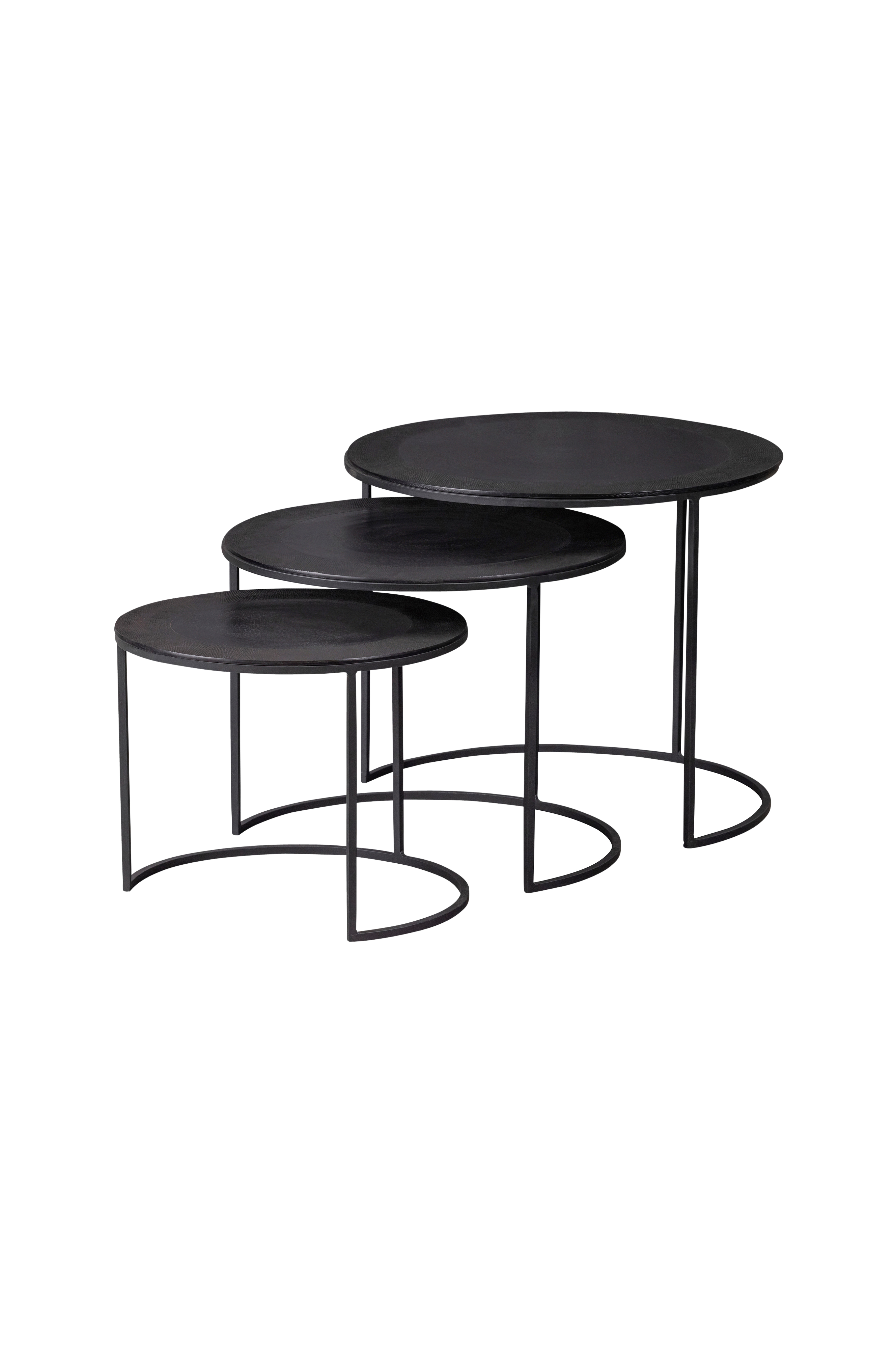 Janna sidobord består av tre runda bord. Set med sidobord av robust metall, ur en kollektion från det nederländska märket WOOOD. En smal stomme av metall i tre olika höjder, med en design som gör att de enkelt kan placeras under varandra. De runda bordsskivorna har en mörkbrun finish och ger därför rummet en varm känsla.