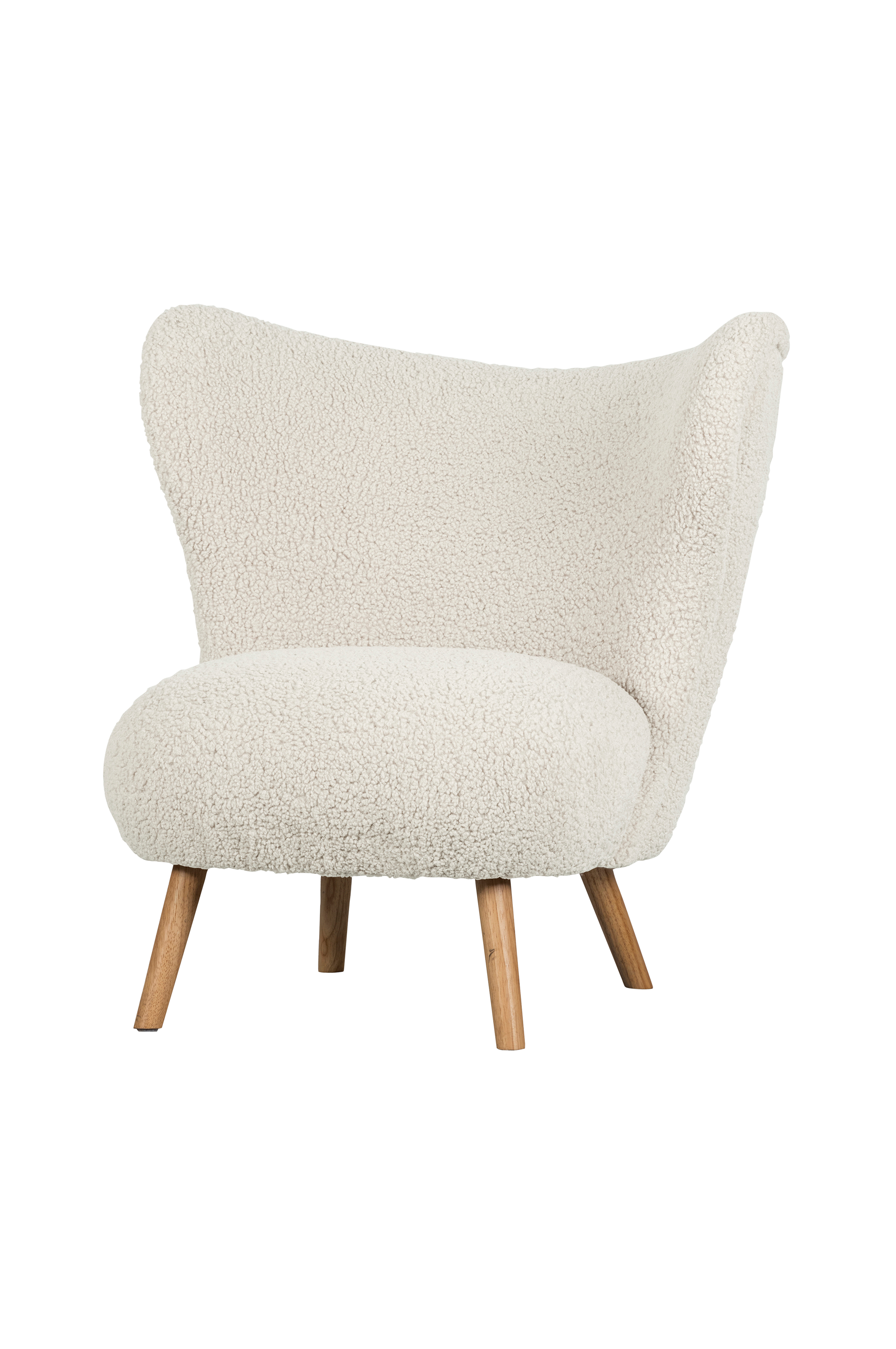 Celine fåtölj är en mycket vacker sittmöbel. Celine fåtölj, ur en kollektion från det nederländska märket WOOOD, har supermjuk klädsel av teddytyg i offwhite färg. Fåtöljen är otvivelaktigt mycket bekväm. Teddytyget är tillverkat av 100% polyester och fåtöljen har fyra stabila träben. Benen har en ljus träfärg vilket ger möbeln en rofylld känsla.