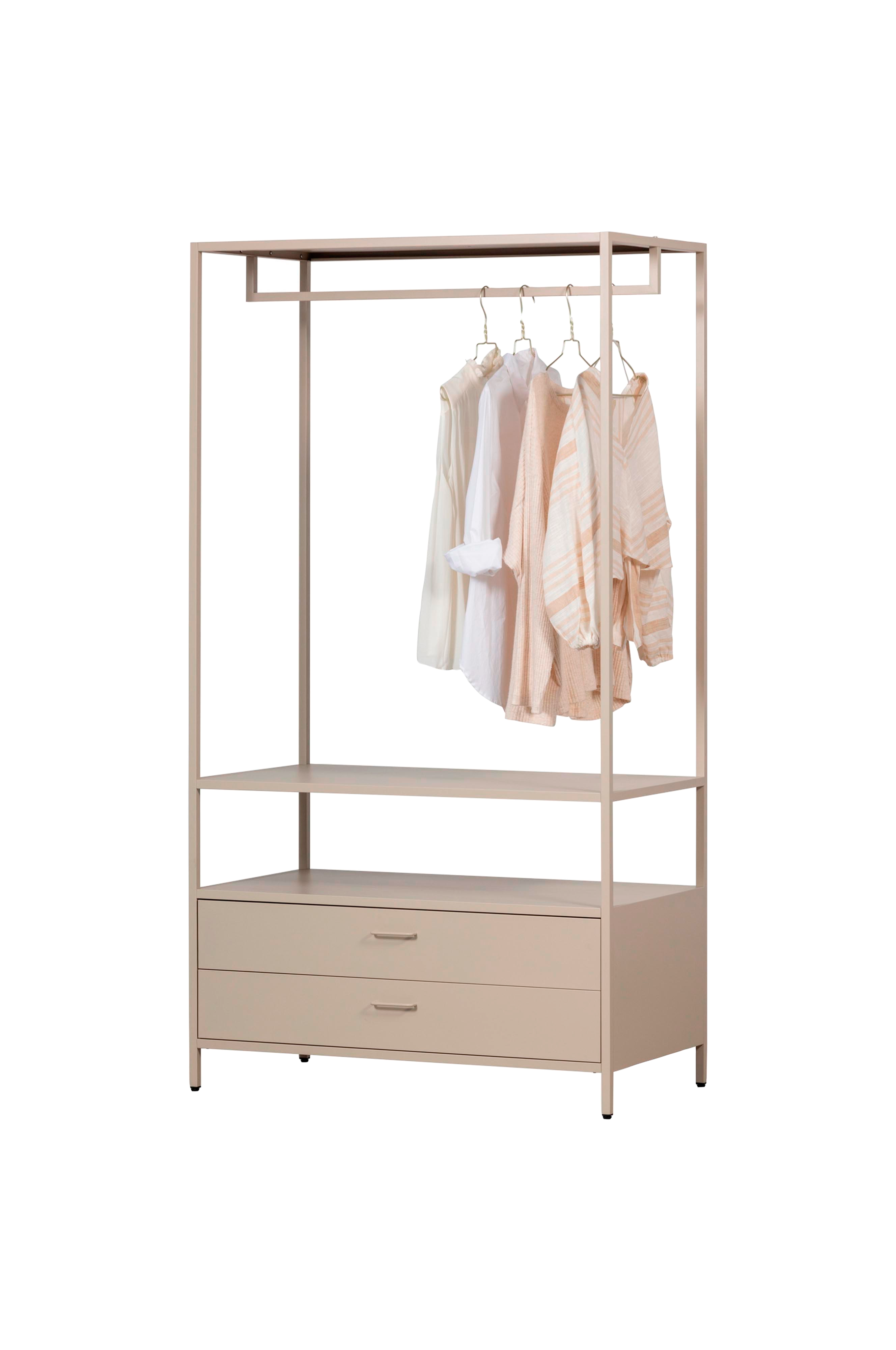 låt inte fler kläder ligga framme med ferris closet. Tack vare den öppna klädhängaren har du alltid en överblick över dina favoritoutfits. Garderoben har två rymliga lådor som är perfekta för förvaring av underkläder, accessoarer eller andra klädesplagg. Den minimalistiska designen passar in i alla sovrum eller walk-in closet och erbjuder gott om förvaringsutrymme.
