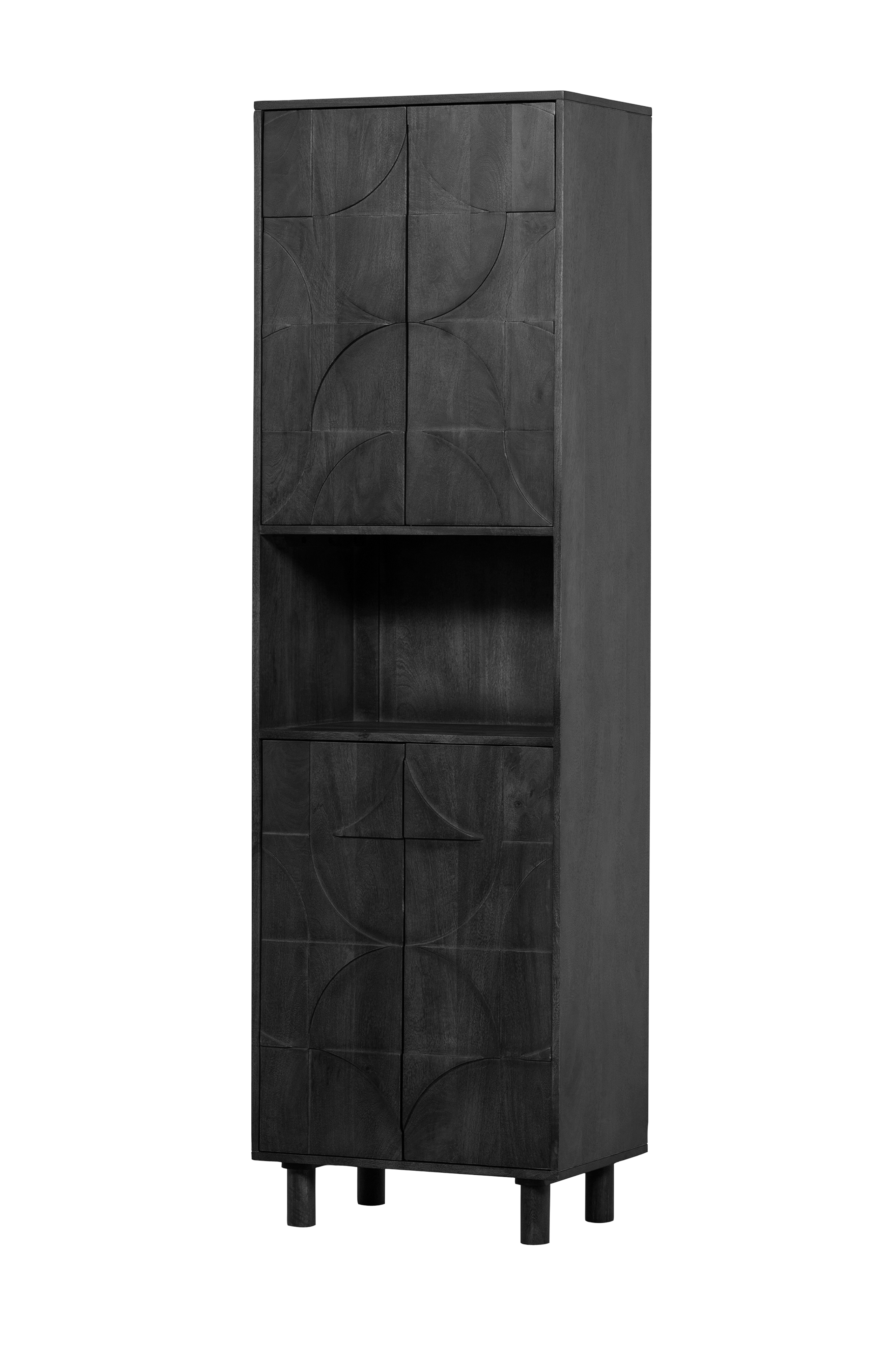 detta karaktärsfulla, höga sideboard ingår i en kollektion från det nederländska märket BePureHome. Mangoträet med en varm, valnötsfärgad finish ger skåpet med 4 dörrar ett attraktivt utseende. De lekfulla benen ger en luftig design och hög stabilitet. 3D-mönstret på dörrarna ger möbeln en unik känsla.