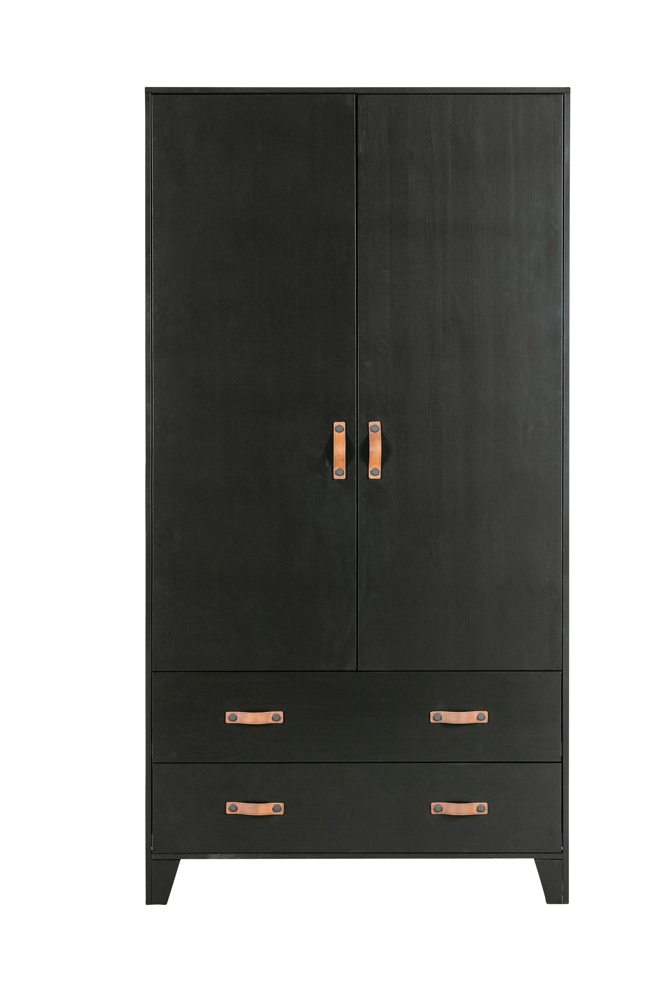 Dian garderob är modern, enkel och lite kaxig. Dian är en anpassad design ur en kollektion från det nederländska märket WOOOD. Garderoben är tillverkad av tall med finish i en snygg, svart färg. Garderoben har två lådor med två svarta metallhandtag per låda och två dörrar med ett svart metallhandtag. Den ger gott om förvaringsutrymme. Den moderna stilen och den robusta känslan gör att garderoben passar i många av hemmets sovrum!