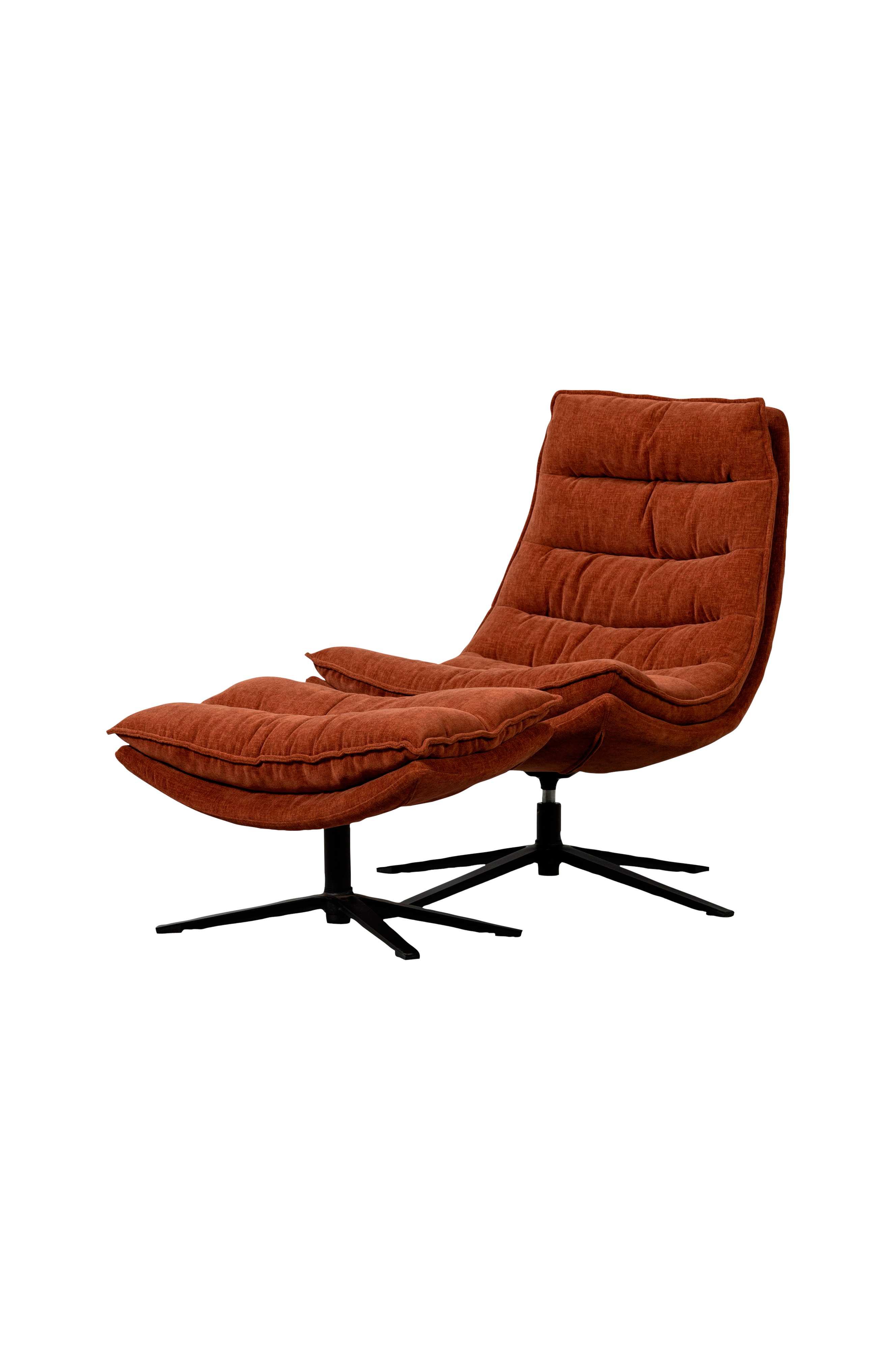 snurrfåtöljen kube med fotpall kommer från det nederländska inredningsmärket woood. Både fåtöljen och fotpallen är klädda i ett mjukt vävt tyg och står på en stadig metallbas. Den svängbara basen gör det enkelt att sätta sig och ökar stolens komfort ytterligare. Detta kommer att bli din nya favoritfåtölj. Lägg upp fötterna och njut!
