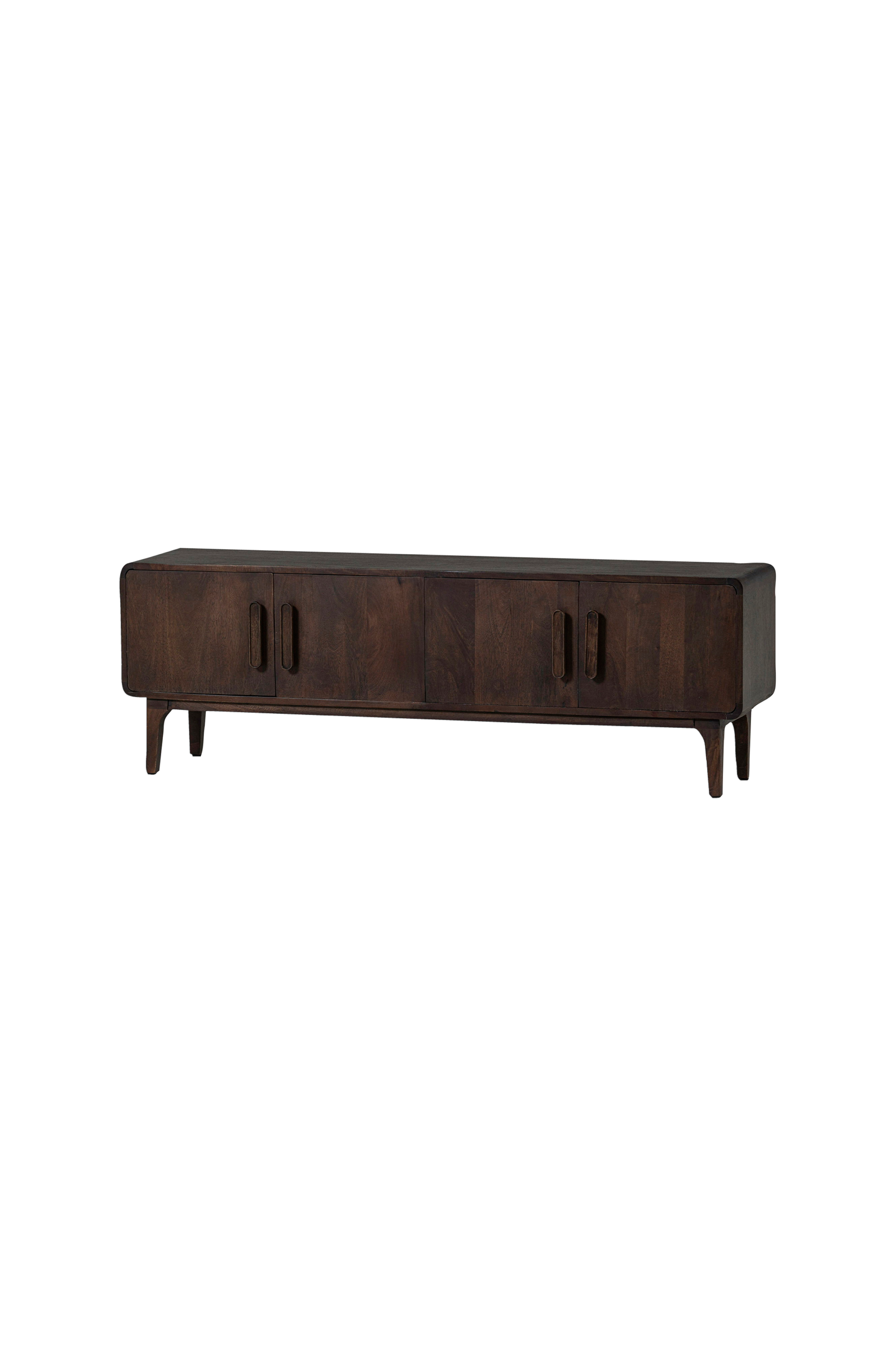 tv-möbeln liya från det holländska inredningsmärket woood ger lugn och värme till ditt vardagsrum. Denna mörkbruna tv-möbel med sina rundade hörn och lyxiga utseende skapar en atmosfär där du kan koppla av efter en hektisk dag. Mangoträet utstrålar karaktär och passar vackert med olika inredningsstilar. Du har tillräckligt med utrymme för all din utrustning samtidigt som det ser snyggt ut. Tv-bänken kommer att bli en central punkt i din inredning där du kan njuta av att titta på dina favoritprogram tillsammans med vänner och familj.