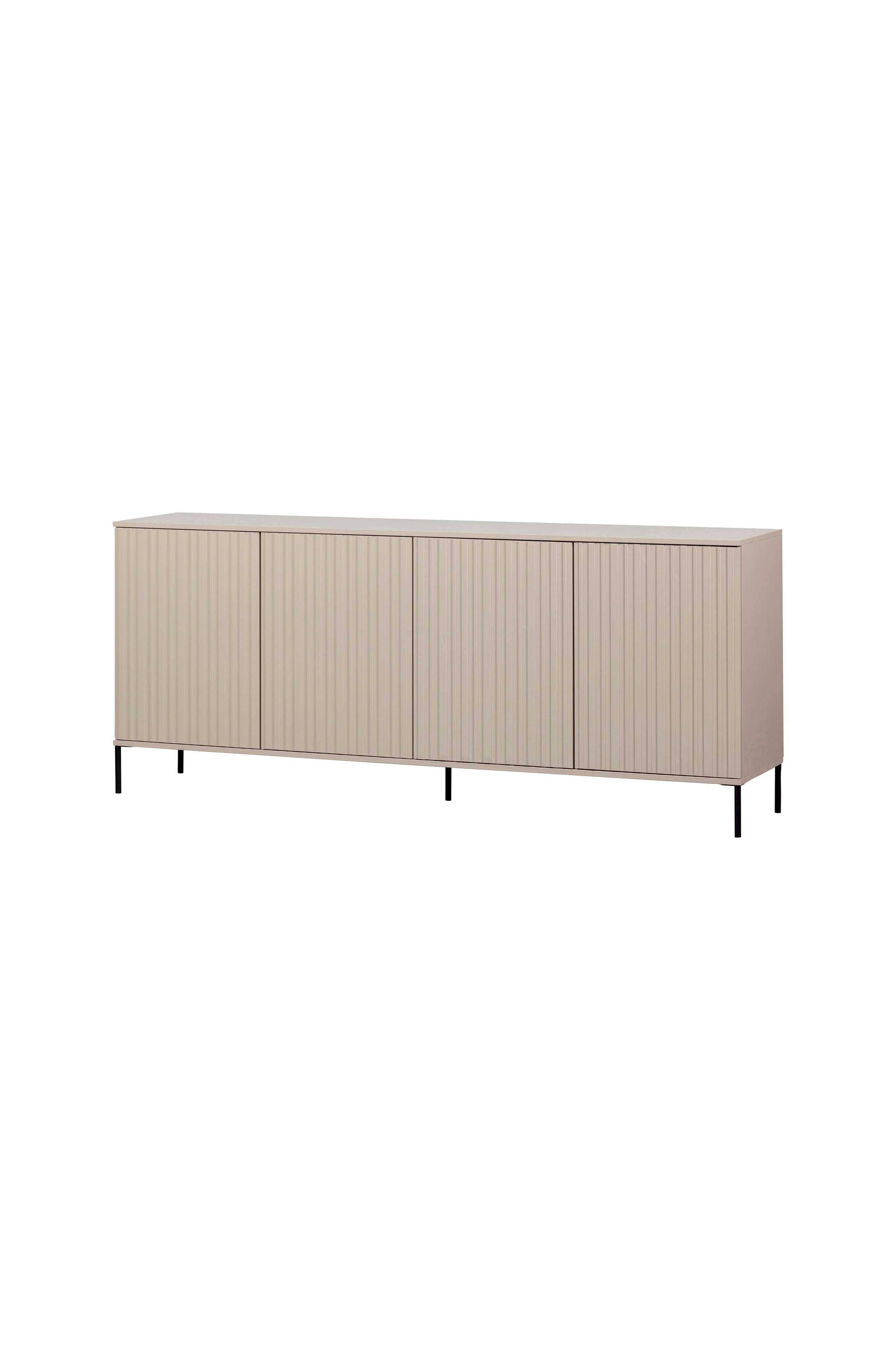 vår framgångsrika gravure-serie i nytt utseende! Denna nya gravure sideboard, från kollektionen av det holländska inredningsmärket woood, har en ännu lite mer generös storlek än sin snygga föregångare. Nya gravure sideboard är tillverkat av furu och ytbehandlat med en dammfärgad lack. Interiören är tillverkad av svart spånskiva. Benen är av metall med en svart beläggning. Det nya gravyrskänken har fyra dörrar med ett tyst push-to-open-system. Koppla sedan ihop de båda sideboardsen enkelt med bara ett ben fram och ett ben bak, snyggt!