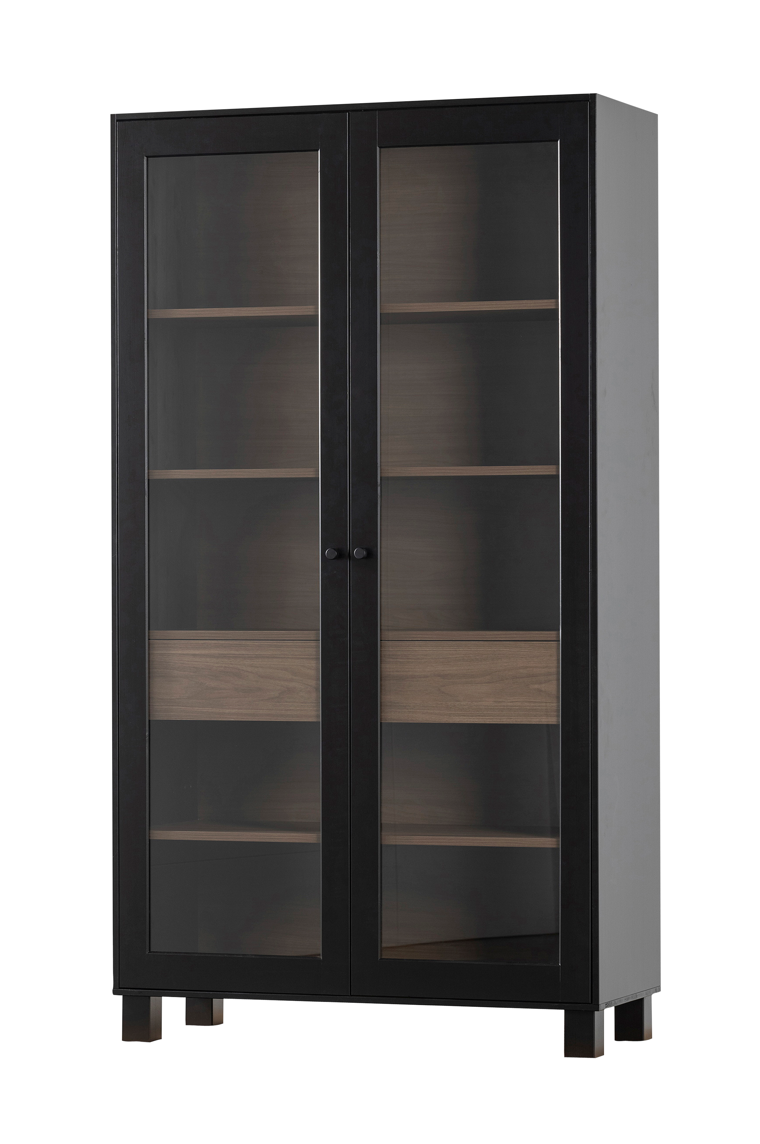 Goos vitrinskåp med 2 dörrar är robust och hamnar garanterat i blickfånget i alla hem. Det rymliga vitrinskåpet ingår i en kollektion från det nederländska märket WOOOD. Goos är tillverkat av furu med mattsvart finish. Valnötsfaneren i varm färg på insidan ger designen en unik twist.