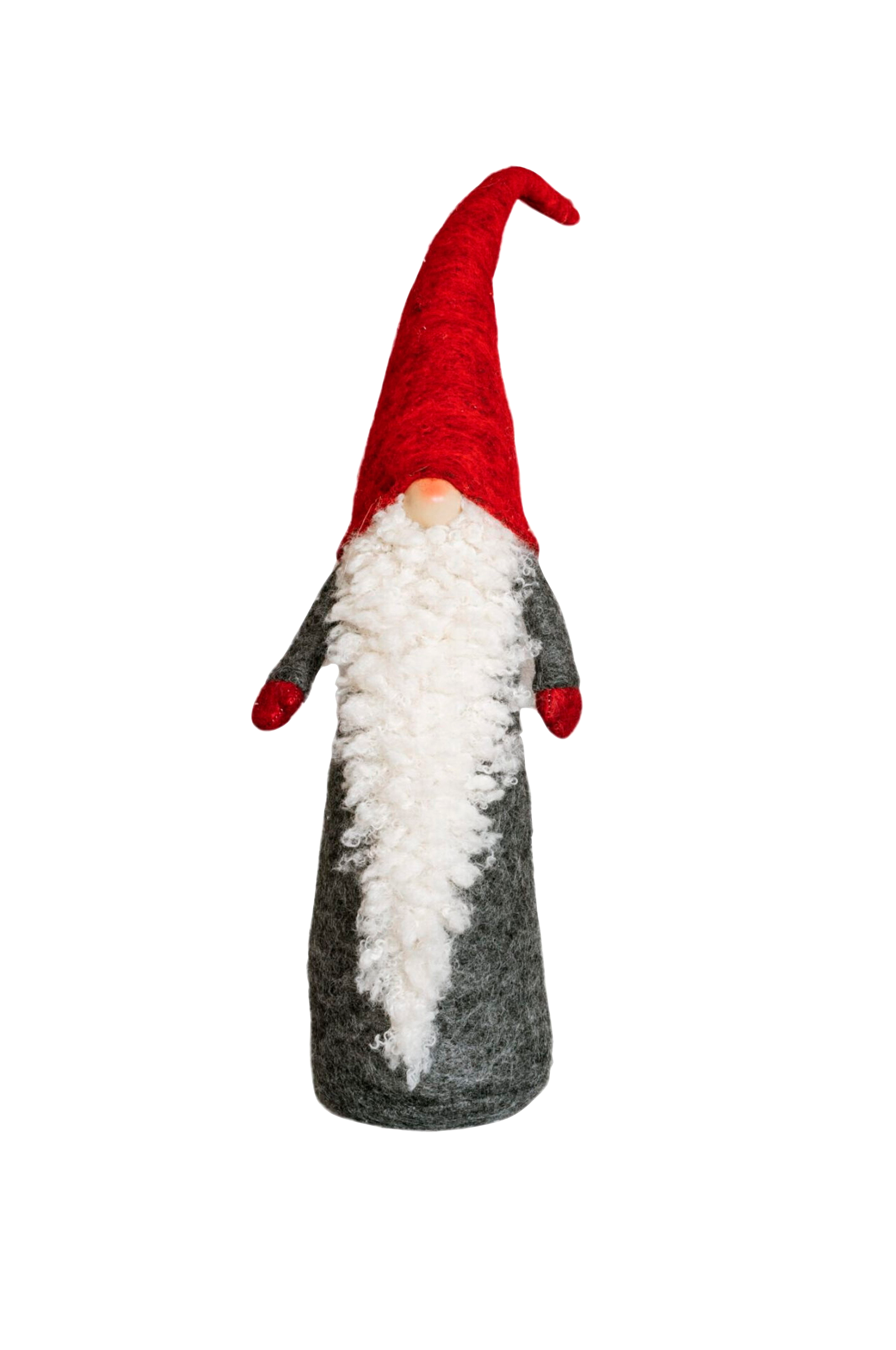 Klassisk tomte med röd luva och lurvigt skägg. Står stadigt och blir en fin juldekoration.