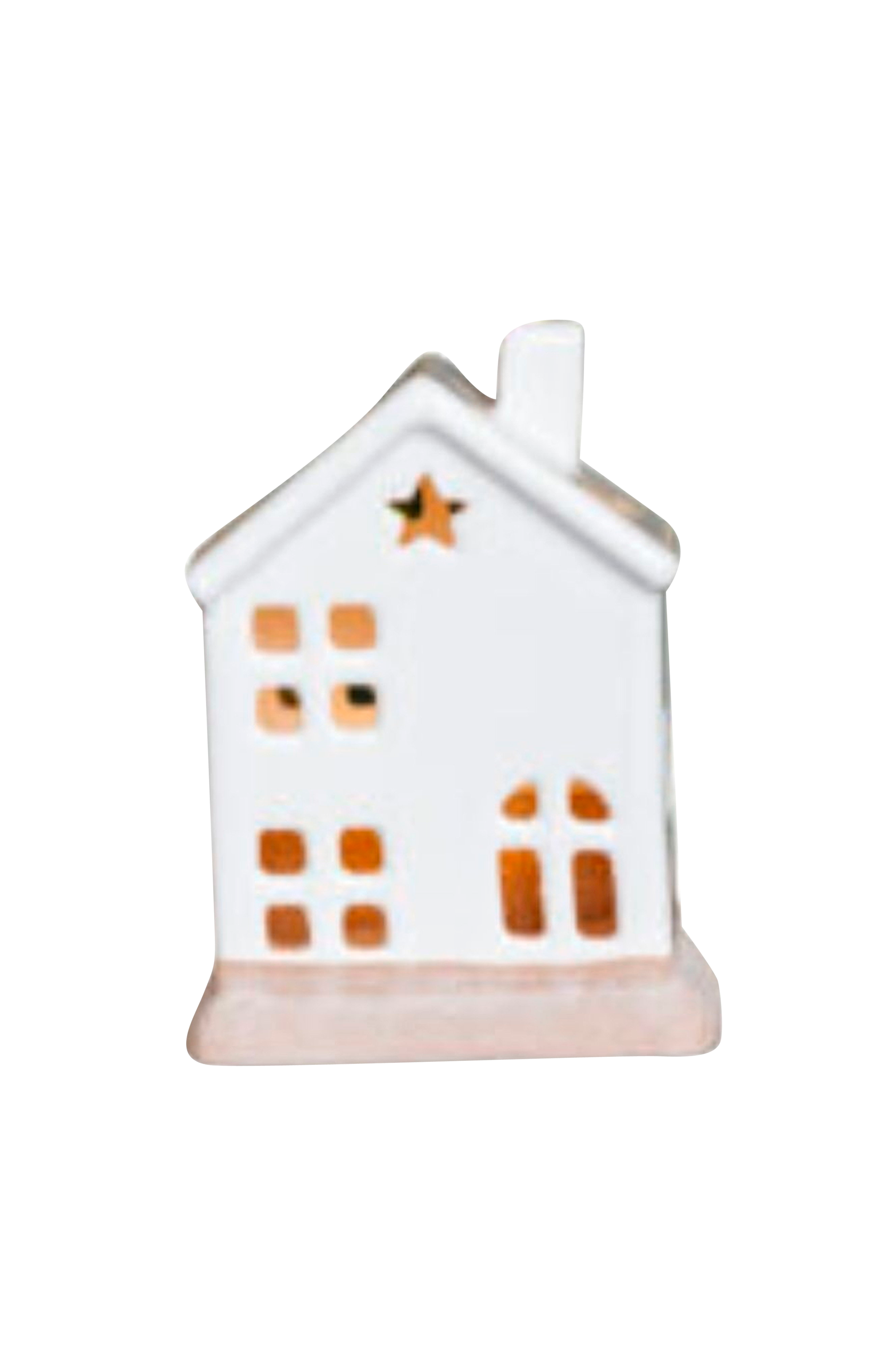Vitt hus med beige grund. Snygg design som skapar en vacker atmosfär i the rum. För värmeljus eller batteriljus.