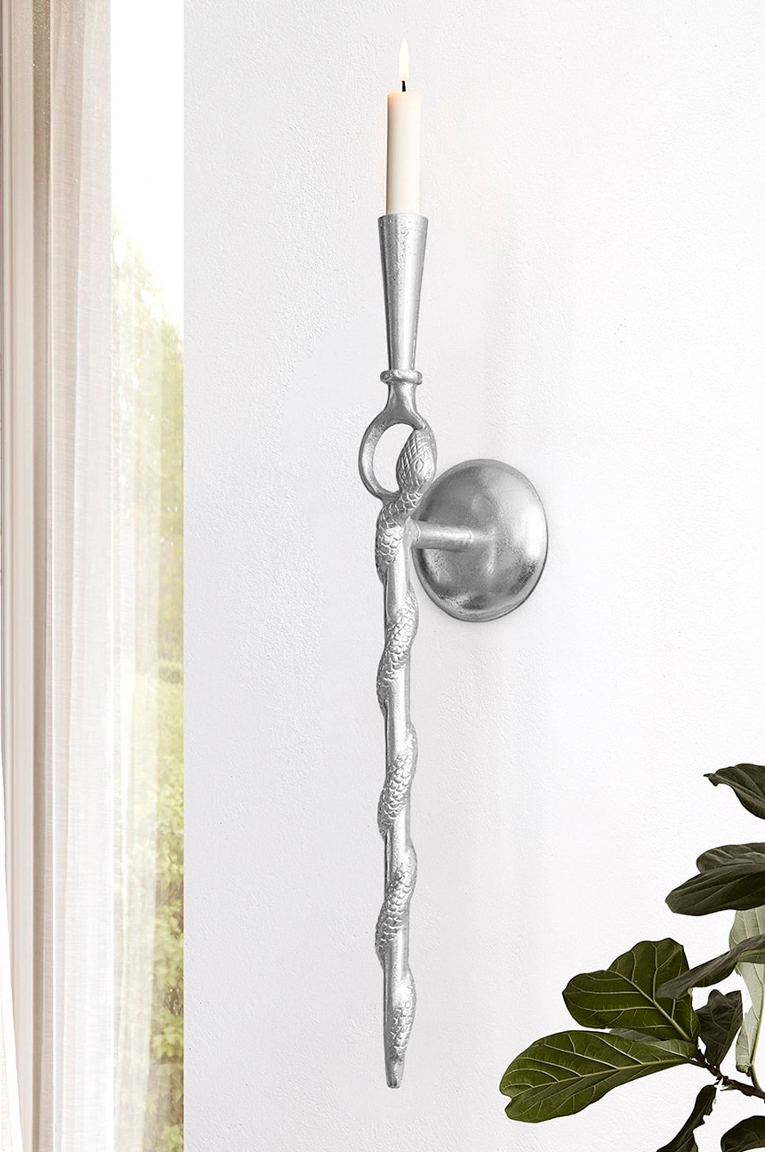 Exklusiv Cape cobra väggljusstake med ormdekoration, tillhör Z collection. Tillverkad i rå aluminium. Höjd 68 cm.